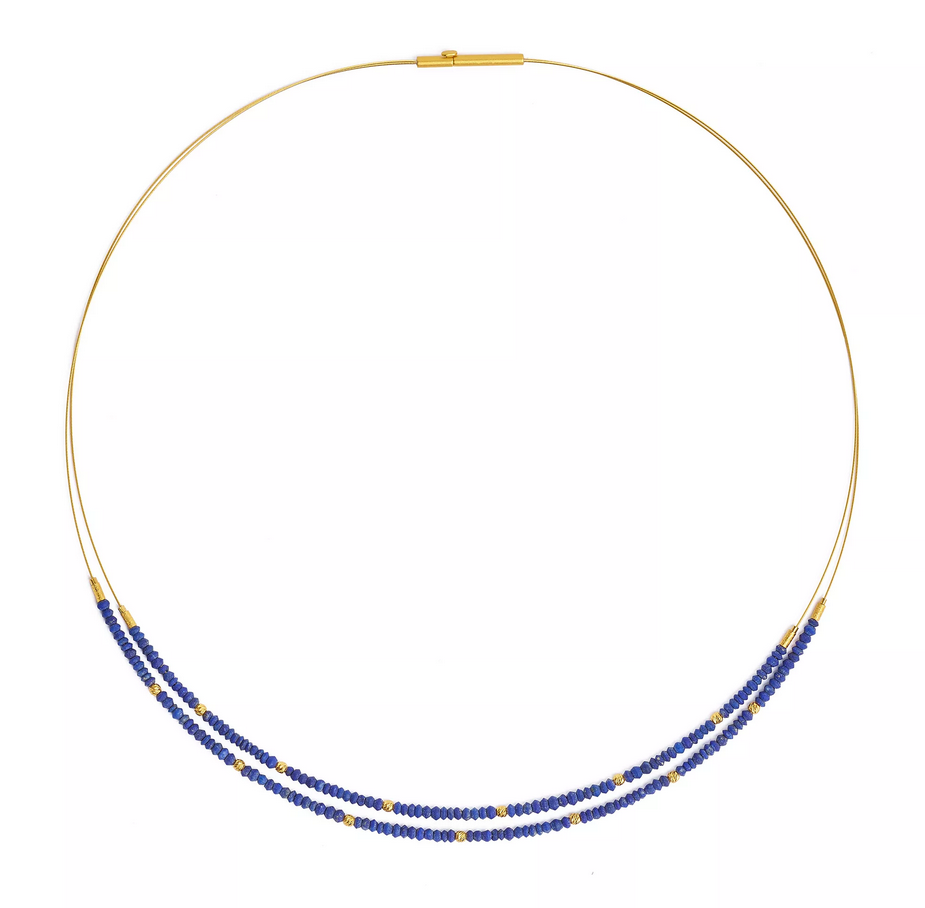 Das Collier Lindi überzeugt mit dezentem Charme. Zwei Reihen matt blauer Lapislazuli in Linsenform sind auf die speziell für die BERND WOLF Manufaktur gefertigten Feinseile gefädelt. Der feine Abstand zwischen den beiden Reihen vermittelt grazile Leichtigkeit. Kleine goldplattierte Kugeln mit faszinierender, funkelnder Spiralstruktur lockern das Gesamtbild auf und machen diesen Halsschmuck zu einem Schmuckstück mit besonderem Flair. Die BERND WOLF Manufaktur steht für unverkennbares und einzigartiges Schmuckdesign - Made in Germany