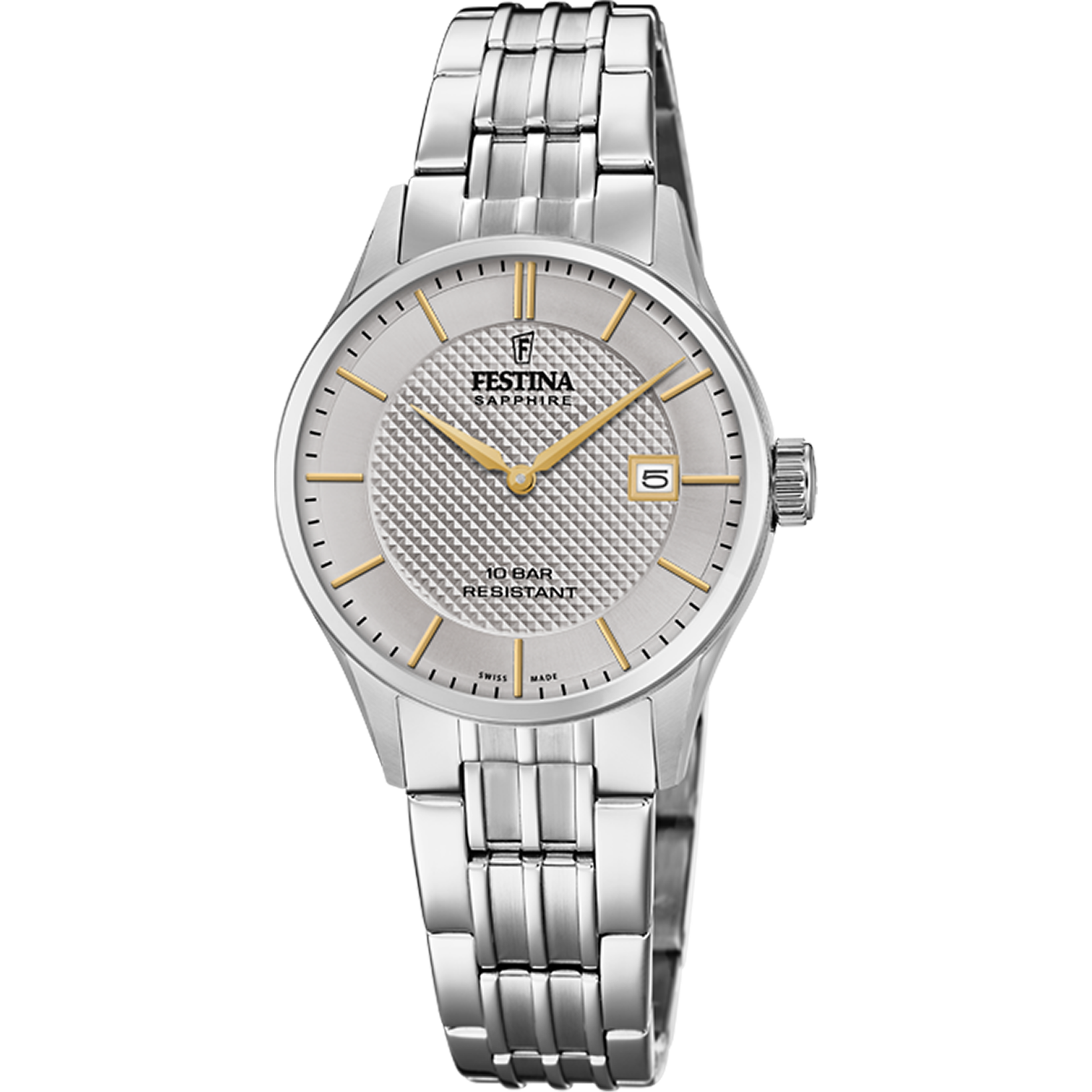 Festina Damenuhr Referenz f20006/2 der Swiss Made Kollektion. Ausgestattet mit einem Edelstahlgehäuse, Saphirglas und einem Edelstahlbband.