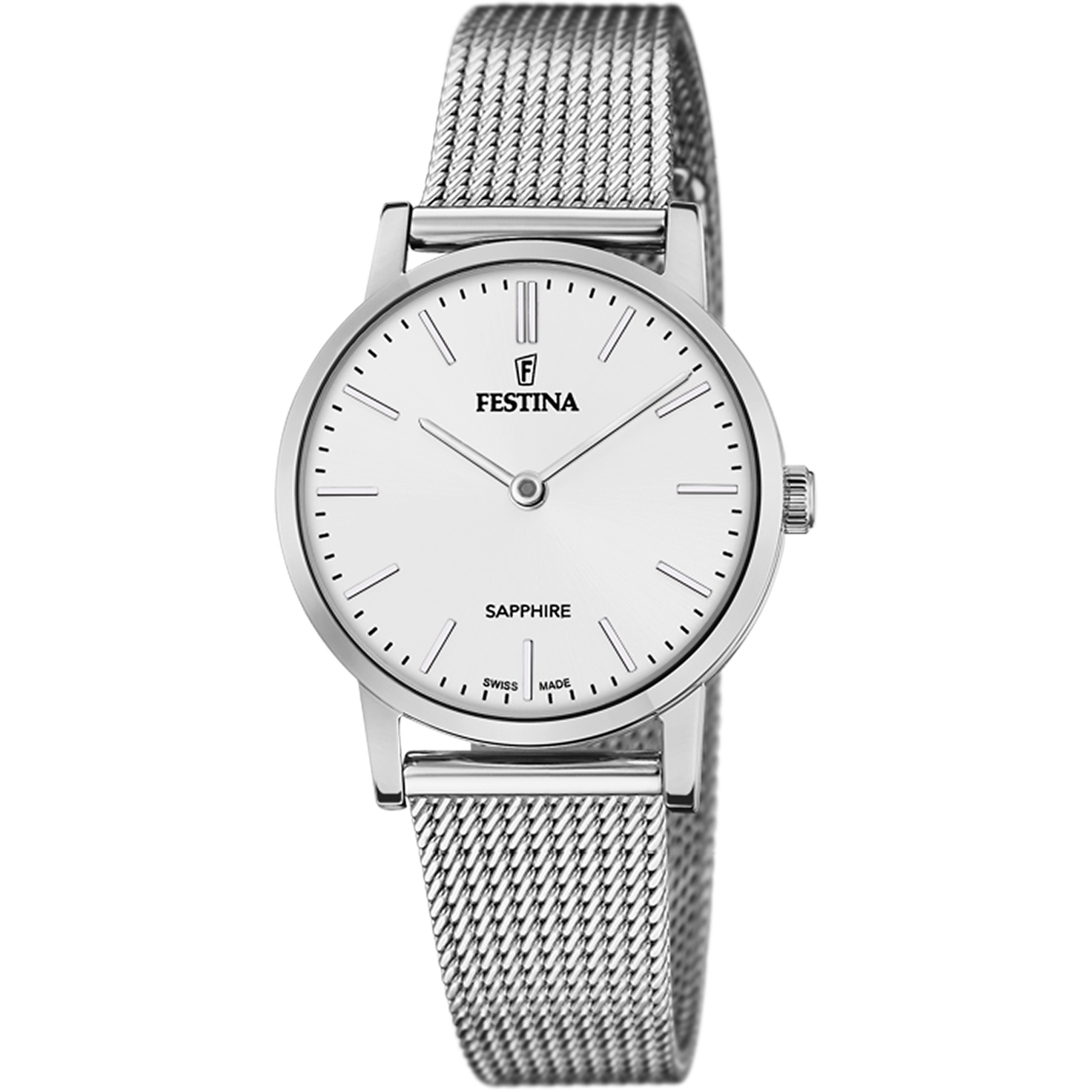 Festina Damenuhr Referenz f20015/1 der Swiss Made Kollektion. Ausgestattet mit einem Edelstahlgehäuse, Saphirglas und einem Edelstahlbband.