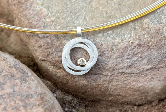 Ein zauberhafter Designanhänger aus sandmattiertem und poliertem 925/- Sterlingsilber besticht durch drei übereinandergelegte Schmuckelemente in attraktiver Ringoptik. Der funkelnde Brillant mit 0,02ct, umrahmt von einer goldbelöteten* (14K) Fassung, lässt den Anhänger zu einem besonderen und stilvollen Schmuckstatement werden. Ein einzigartiges Design aus der Feder der Düsseldorfer Designerin Nadine Resch. Zusammen mit den passenden Ohrsteckern und dem passenden Ring ist dieser Designanhänger vielfältig kombinierbar.
