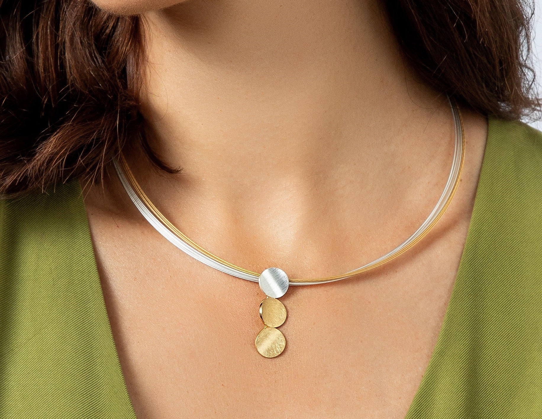 Vertikal ausgerichteter Anhänger "Moon & Sun" aus 3 kreisrunden, teilweise gelbgoldvergoldeten Elementen aus Sterlingsilber. Die kratzmattierte sowie strichmattierte Oberflächenbeschaffenheit im attraktiven Wechselspiel macht dieses bicolore Schmuckdesign aus der Feder der deutschen Designerin Nadine Resch zu einem ganz besonderen Statement. Die flexiblen Elemente greifen jede Bewegung der Schmuckträgerin subtil auf und sorgen für eine luftig-leichte Austrahlung des charakterstarken Designs. Wir empfehlen diesen Anhänger in Kombination mit den dazugehörigen Ohrsteckern und mit dem bicoloren Mehrstrangreif 43500.