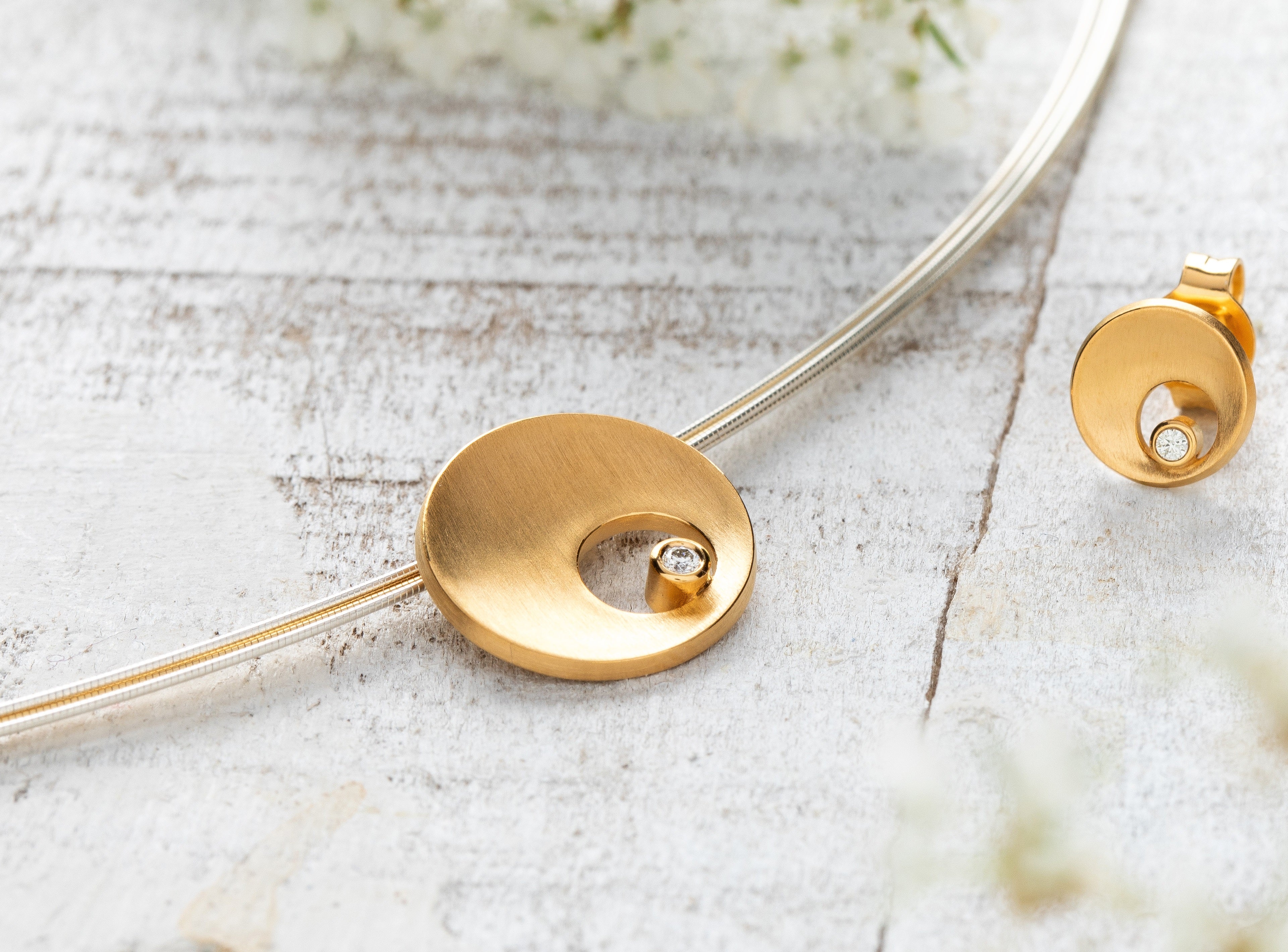 Wunderschöner, 18 Karat gelbvergoldeter Anhänger "Pantheon" in einer runden, leicht konkaven Ausführung. Gekrönt wird dieses liebevoll gestaltete Schmuckstück durch einen Diamanten im wertigen Brillantschliff mit 0,02ct (W-SI), welcher asymmetrisch in einem Cut-Out platziert wurde. Das Spiel aus Geometrie und Positionierung macht dieses Designschmuckstück zu einem attraktiven Hingucker. Mit passenden Ohrsteckern erhältlich.